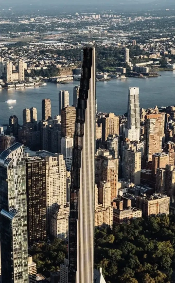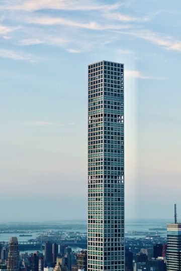 Nejštíhlejší rezidenční věž NYC. Čistá geometrie, bílé čtvercové fasády. Poměr výška/šířka 1:15.