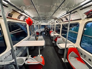 Před tramvají se nachází přenosné ohniště na kterém můžete opékat buřty nebo se jen s pivem v ruce ohřát.