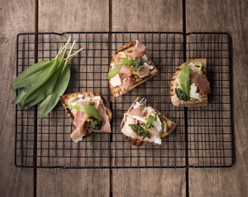 Máslo smícháme s pistáciemi a ochutíme solí a pepřem. Chléb opečeme na oleji z obou stran dokřupava. Mírně potřeme česnekem a naneseme pistáciové máslo. Navrch narovnáme plátky prosciutta. Na závěr posypeme parmazánem, případně zbylými pistáciemi.