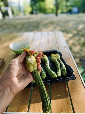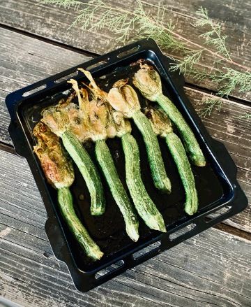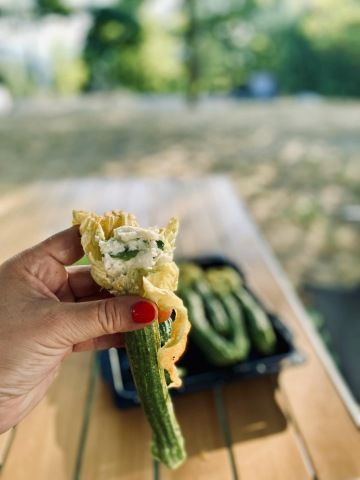 Sýr rozmíchejte s bylinkami, pepřem, případně dosolte. Květy cuket rozviňte z jedné strany, položte do dlaně a vyplňte hotovou náplní. Pak znovu spojte květ a jeho vrcholek zatočte. Na plech vymazaný olivovým olejem položte cuketky a dejte do trouby péct na 180 stupňů 15-20 minut.