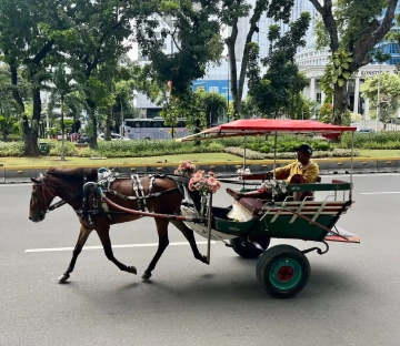 Také pro koňské povozy platí v centru Jakarty různá omezení. Jejich přítomnost je regulovaná, ale stále tolerovaná. Ne jako praktické řešení dopravy, ale jako součást městské identity.