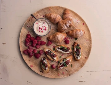 Džem a tvarohový krém servírujeme s croissanty, čerstvými malinami a rozpuštěnou hořkou čokoládou. Dozdobíme lístky čerstvé máty.