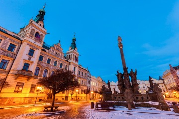 MHD jízdenka na 24 h stojí 50 Kč. Linkou 13, 88 nebo 9 se dostanete do centra na náměstí Republiky. Odtud můžeme buď projít pod 60metrovou vyhlídkovou věží, zvanou Zelená brána na historicky cenné Pernštýnské náměstí se zachovalými měšťanskými domy s bohatě zdobenými fasádami. Mezi nimi vyniká proslulá fasáda domu U Jonáše z konce 18. století. Na náměstí najdeme celou řadu příjemných restaurací a barů. Doporučujeme indickou restauraci Namaste.