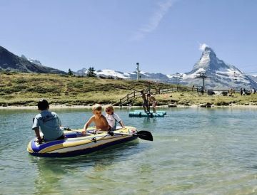 Je tu postavený přírodní dětský park s hřištěm, piknikovými místy, tobogánem do vody i grilovacími ohništi. Do toho výhled na Matterhorn – a lanovkou zpět, když jsou nožky unavené.