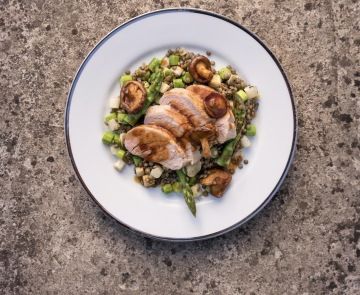 Čočku vaříme ve vodě s bobkovými listy, dokud nezměkne. Dáváme pozor, abychom ji nerozvařili. Chřest blanšírujeme ve vroucí osolené vodě. Potom jej přecedíme, necháme okapat a nakrájíme na menší kousky.