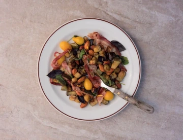 V kuchyni kde se potkává jednoduchost s elegancí vznikají jídla která nepotřebují složité příběhy. Lilek slanina rajčata a mandle čtyři ingredience které společně tvoří harmonii chutí a textur. Restovaný lilek absorbuje chuť slaniny cherry rajčata přidávají sladkost a mandle křupavost. Bylinky jako šalvěj a bazalka dodávají svěžest a aroma.