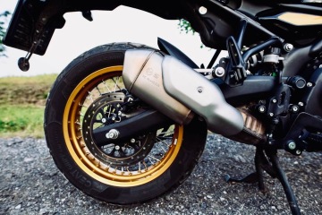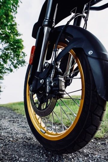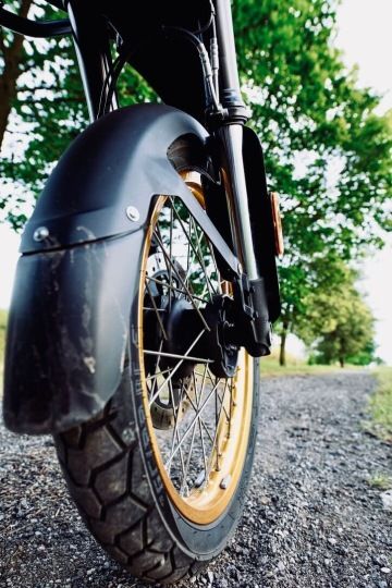 Když si v pátek vyzvednu mašinu ve Vintage Garage Motors, chodím nejdřív kolem a kochám se siluetou a detaily. Líbí se mi zlaté ráfky s výpletem a vpředu „terénní jednadvacítka“, která se 140kou zadní gumou a prodlouženou zadní kyvkou dodává motorce dospělý vzhled. Oproti tomu ale není motorka v přední části nijak mohutná ani vysoká, má jen malý plexi štítek a v kontextu mojí výšky 188 cm, jsem zvědav, jak se mi na ní bude sedět.