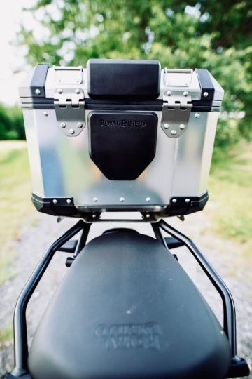 Ve standardní výbavě nechybí padací rámy okolo nádrže s logem Royal Enfield, které mají navařené háčky na připevnění malých bočních tašek. Testovaný model měl navíc ve výbavě plotnu a hliníkový topcase vystlaný textilií, centrální stojan a za příplatek spodní padací rámy kolem motoru.