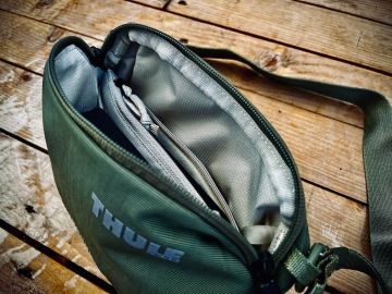 Do Thule Paramount crossbody 2 l se dostaneme rozepnutím zipu se dvěma jezdci. Uvnitř najdeme prostor rozdělený jednou polstrovanou přepážkou – která je zároveň kapsou, do níž lze bezpečně uložit telefon, i když iPhone 13 Mini se vejde tak tak. Další úložné prostory jsou dvě síťované kapsy. Chytrým doplňkem je klip na klíče.